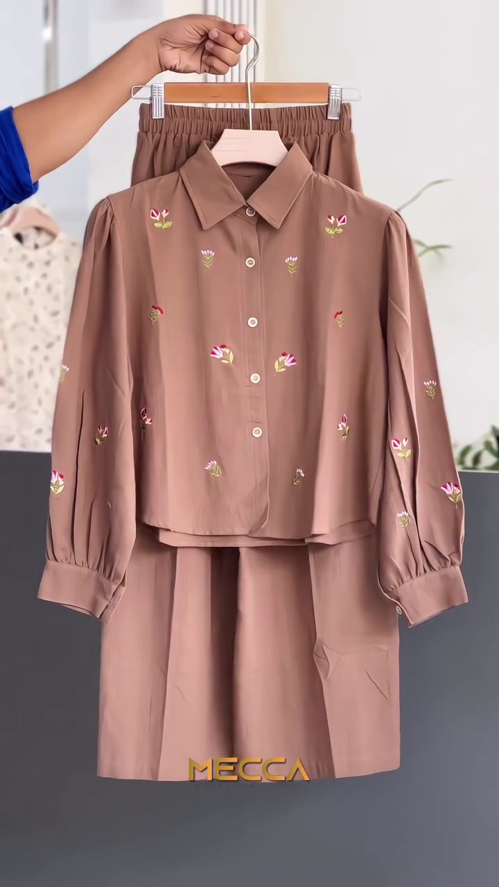 The set features a button-down collared shirt crafted from lightweight, breathable fabric that feels soft against the skin. The rich brown base is beautifully enhanced with delicate floral embroidery, adding a subtle pop of color and a refined feminine touch. The embroidery is thoughtfully placed across the shirt, making it elegant yet understated—ideal for women who prefer minimal detailing with a classy finish.