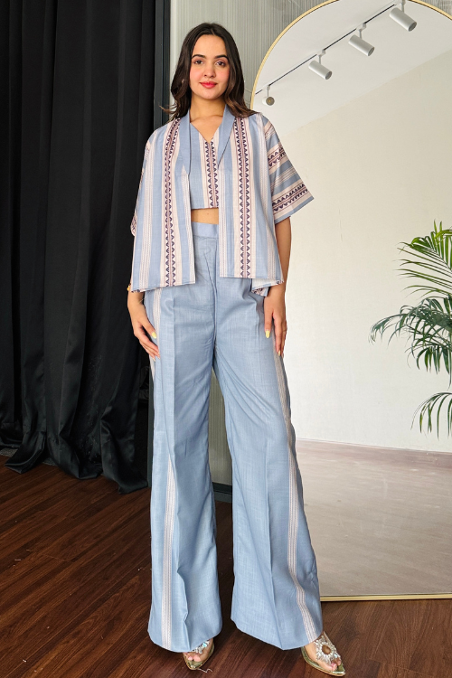 A relaxed yet refined denim blue co-ord crafted in soft fabric — perfect for effortless summer styling. Paired with high-waisted, wide-leg trousers,the set offers comfort without compromising on style.