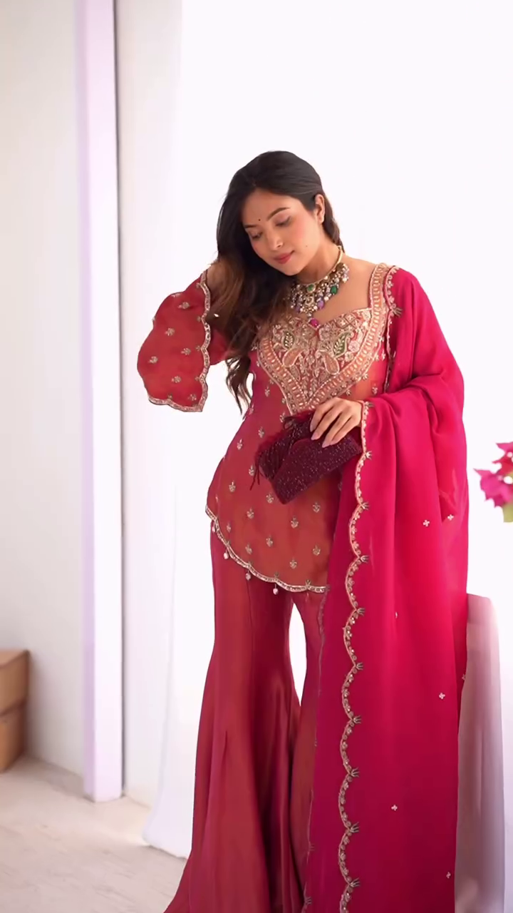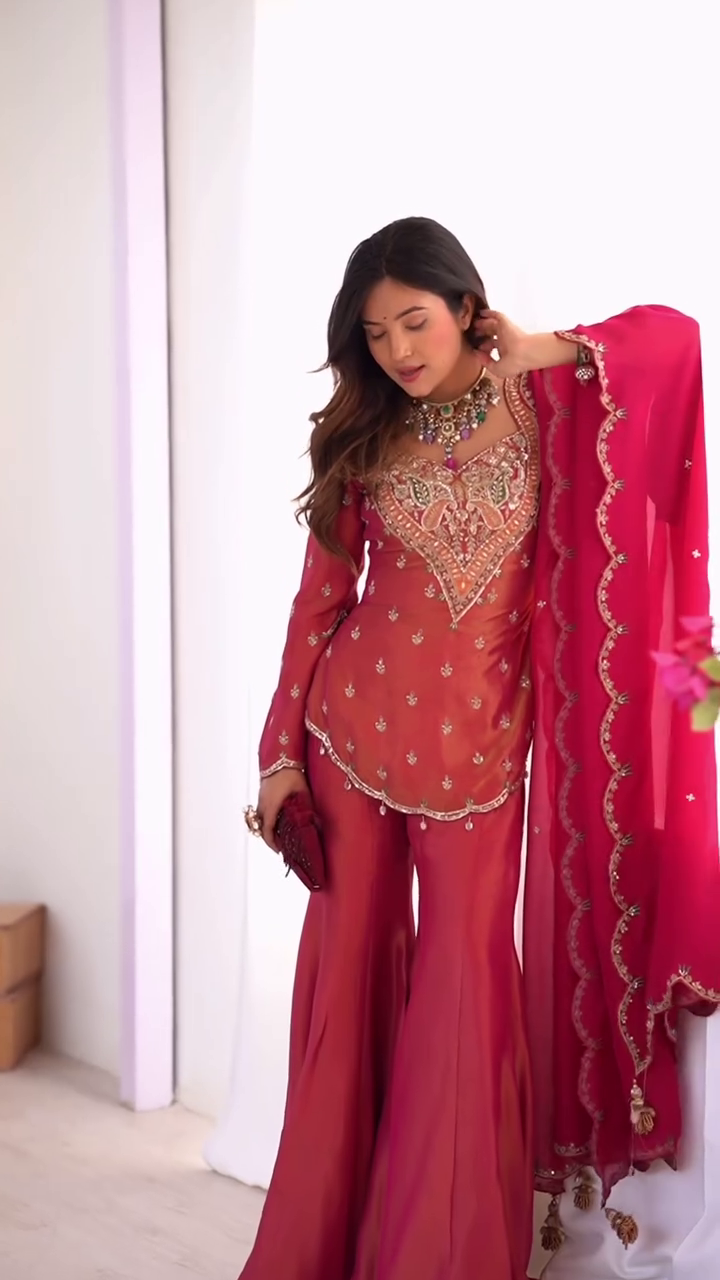 Turn heads with this designer red sharara suit featuring heavy embroidery, a flared bottom, and a matching embellished dupatta. Ideal for weddings, receptions, and festive occasions, this ethnic outfit blends traditional craftsmanship with modern elegance for a luxurious, statement look.