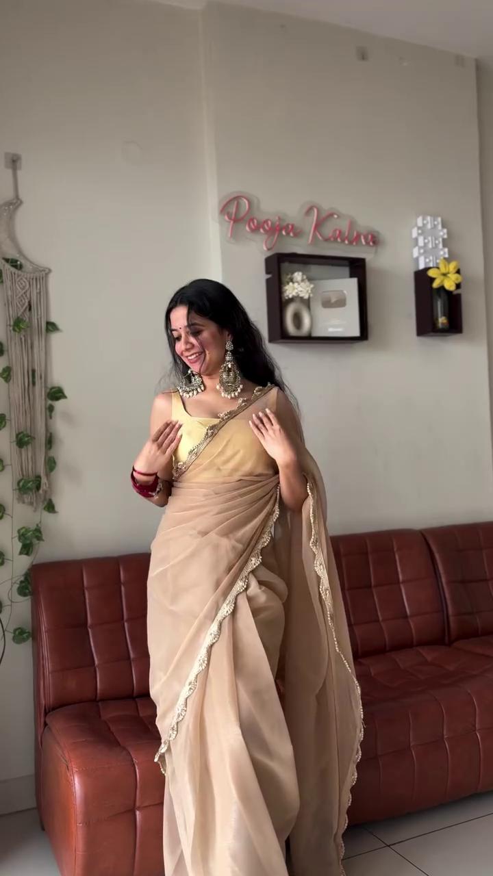 If you’re looking for an outfit that feels luxurious yet simple, traditional yet modern, and eye-catching yet graceful, this beige saree with gold blouse and embellished border is an ideal wardrobe addition. It captures the essence of timeless Indian style while remaining effortlessly wearable for today’s celebrations.