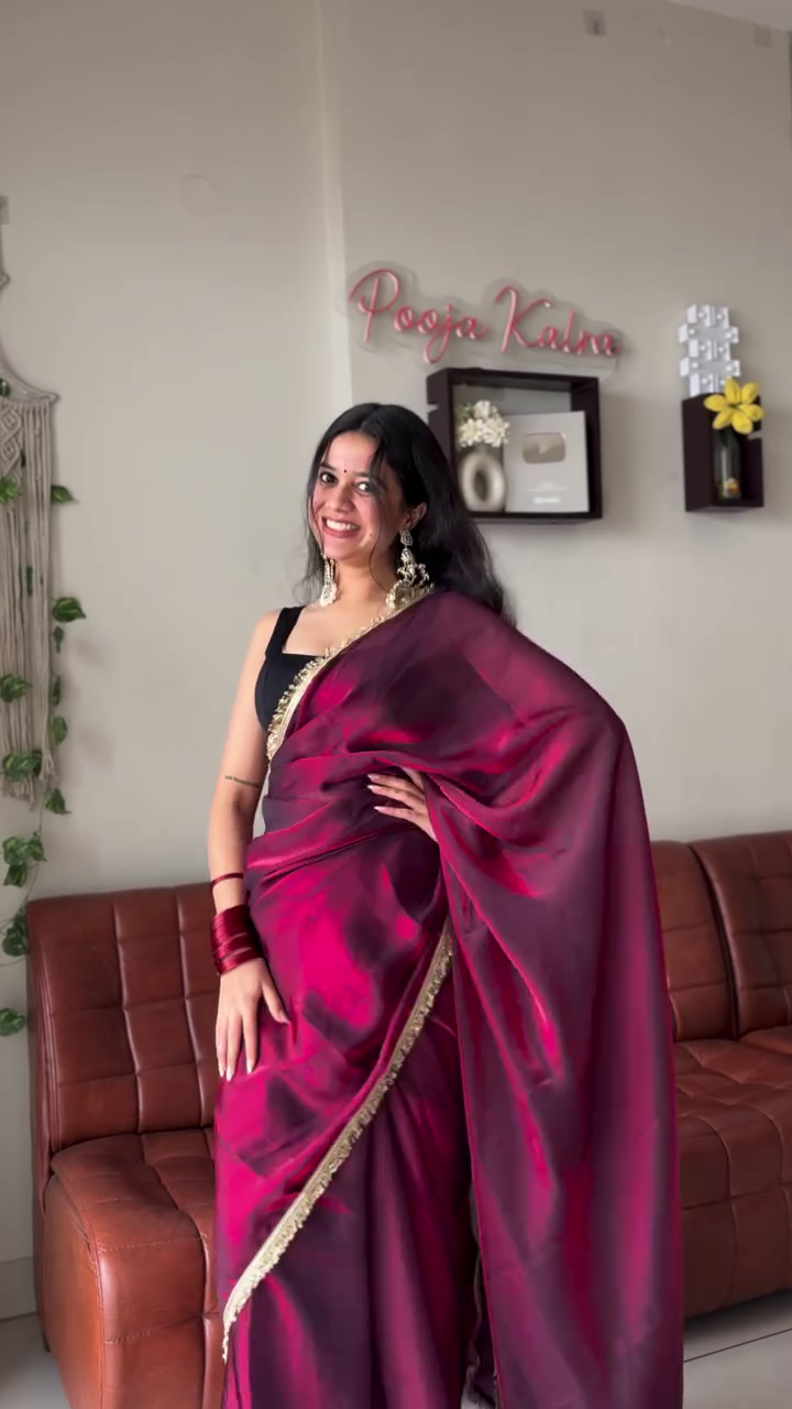 The saree features a delicate embellished border that adds just the right amount of shimmer without overpowering the overall look. This subtle decorative edge elevates the outfit, making it suitable for both day and evening events. The light-reflective detailing along the border frames the drape beautifully in photos and real-life settings, giving you a polished, camera-ready appearance. The fabric appears lightweight and breathable, ensuring comfort for long celebrations, rituals, and gatherings.