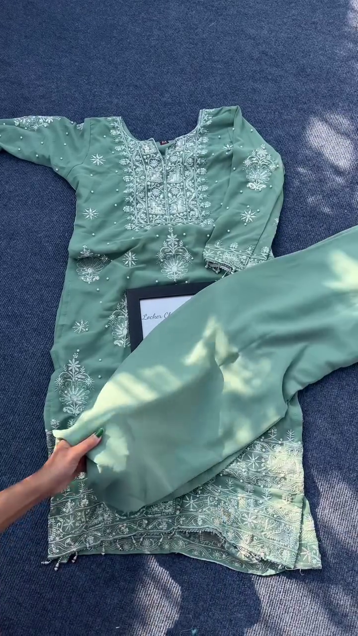 Elegant sage green color with white thread embroidery