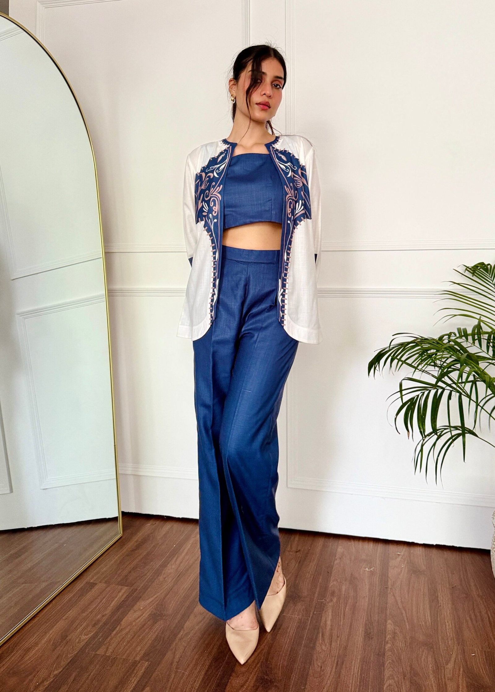 A refined balance of structure and softness, this ensemble pairs the deep, moody richness of dark tones with the crisp brightness of a white overlay, creating a modern contrast that’s equal parts classic and contemporary.