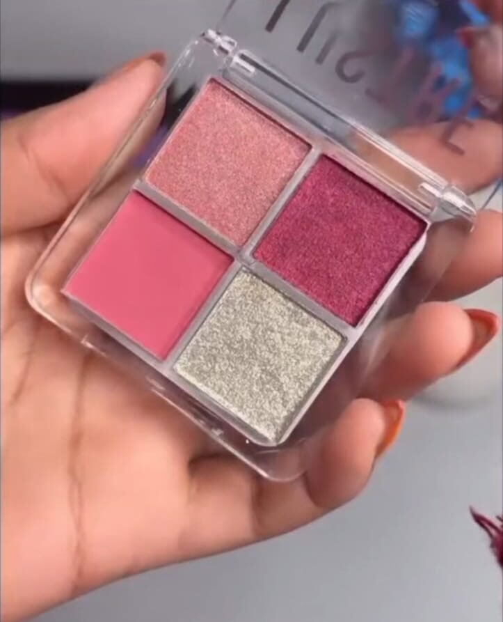 A compact eyeshadow palette featuring four shades in soft pink, rose, mauve, and shimmering silver. The mix of matte and glitter finishes makes it versatile for both everyday looks and glamorous eye makeup. The clear plastic case shows the colors clearly, and the palette is held in hand, highlighting its small, travel-friendly size.