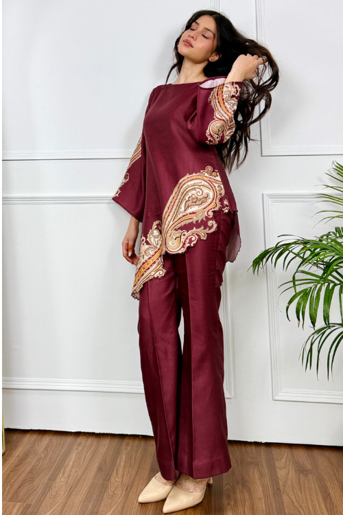 Elevate your Festive wardrobe with this elegant Paisley Cutwork Kurta Set, a striking ensemble that fuses classic charm with artisanal craftsmanship. The Top is crafted from soft, breathable fabric—rich in tone and texture—featuring a delicate paisley print enhanced with intricate cutwork embroidery.