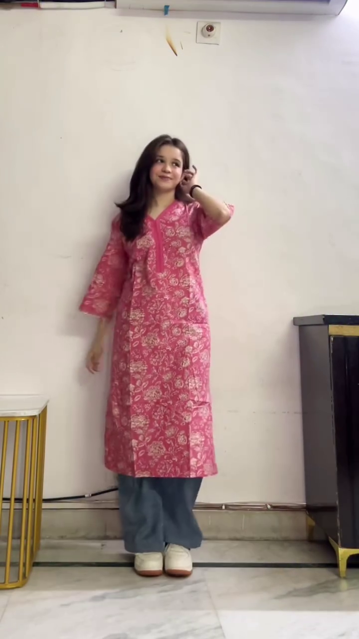Pink Floral Kurti with Wide-Leg Jeans – Casual Ethnic Fusion Outfit