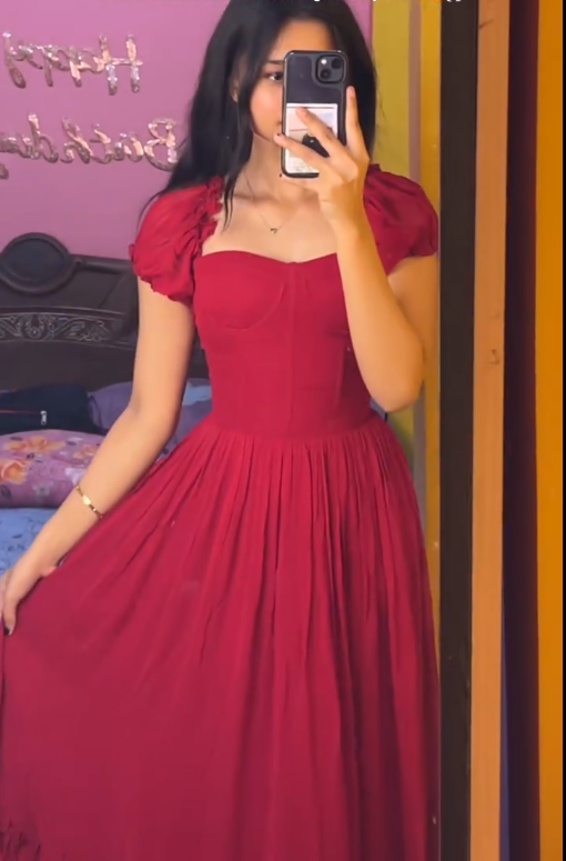 Elegant red puff sleeve fit and flare dress with a structured bodice and flowy skirt, perfect for date nights, parties, and festive styling. A romantic statement outfit that creates a flattering silhouette and eye-catching mirror selfie look.