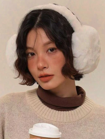 A softly styled winter portrait featuring plush white earmuffs and warm knit layers. The natural makeup, gentle blush tones, and relaxed expression create an intimate, cozy atmosphere—perfectly capturing quiet winter mornings and effortless seasonal elegance.
