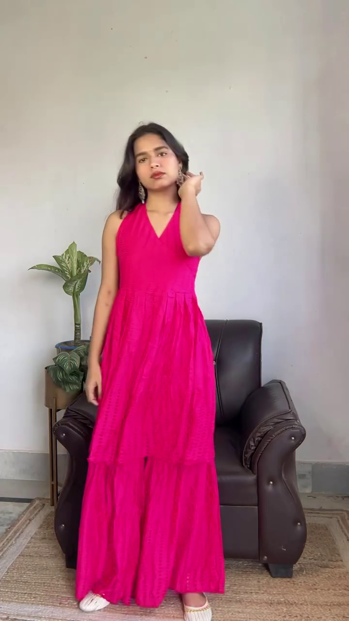 Crafted for both style and comfort, this maxi dress offers a relaxed fit that suits long hours of wear. The bright hot pink shade adds energy and confidence to your look, making it ideal for photos, celebrations, and social occasions. The textured fabric and tiered construction give the dress added dimension and a boutique-inspired finish.