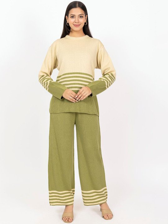 Refresh your everyday wardrobe with this stylish Women’s Olive Green & Beige Knit Co-Ord Set, designed to deliver effortless elegance, comfort, and versatility. Featuring a beautifully balanced striped knit sweater top paired with matching wide-leg knit pants, this coordinated outfit is perfect for women who love minimal yet refined fashion.